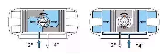 當(dāng)氣源壓力從氣口(2)進(jìn)入氣缸兩活塞之間中腔時,使兩活塞分離向氣缸兩端方向移動,迫使兩端的彈簧壓縮,兩端氣腔的空氣通過氣口(4)排出,同時使兩活塞齒條同步帶動輸出軸(齒輪)逆時針方向旋轉(zhuǎn)。在氣源壓力經(jīng)過電磁閥換向后,氣缸的兩活塞在彈簧的彈力下向中間方向移動,中間氣腔的空氣從氣口(2)排出,同時使兩活塞齒條同步帶動輸出軸(齒輪)順時針方向旋轉(zhuǎn)。(如果把活塞相對反方向安裝,彈簧復(fù)位時輸出軸即變?yōu)榉聪蛐D(zhuǎn))。