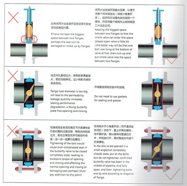 3、在蝶閥完全關(guān)閉的情況下擰緊螺栓會引起襯圈的過度壓縮,導(dǎo)致啟閉扭矩過大,影響正常啟閉并可能損壞閥座!