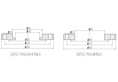 對(duì)夾式碟閥使用的法蘭不是普通的平焊法蘭,而是定做的對(duì)夾式蝶閥專用法蘭。這是因?yàn)閷?duì)夾式蝶閥有一個(gè)稍大蝶閥通徑的密封面,如果用普通的平焊法蘭與對(duì)夾蝶閥連接,法蘭與蝶閥的密封面接觸尺寸較小,會(huì)影響密封效果,造成泄漏。所以對(duì)夾式蝶閥法蘭造有兩個(gè)內(nèi)徑,對(duì)夾式蝶閥法蘭外形同不帶頸的承插焊法蘭相似,小內(nèi)徑和通徑差不多大,用于保證蝶閥密封效果。對(duì)夾式蝶閥專用法蘭沒有標(biāo)準(zhǔn)號(hào),是按行業(yè)內(nèi)的常規(guī)制作的。對(duì)夾式碟閥專用法蘭的其他尺寸與普通平焊法蘭相同,按法蘭標(biāo)準(zhǔn)(比如JB81-94、GB9112、ASME B16.5、HG20592等)執(zhí)行,且螺柱穿過法蘭時(shí)保證蝶閥閥體而不與閥體干涉。同時(shí)法蘭的小內(nèi)徑尺寸不能過小,應(yīng)保證對(duì)應(yīng)的蝶閥閥板能夠完全打開。法蘭的大內(nèi)徑和普通平焊法蘭內(nèi)徑一樣110mm,大內(nèi)徑是用于法蘭與108mm的管道焊接用。全部襯膠的蝶閥選蝶式法蘭也就是承插焊的平焊法蘭,若是金屬密封面的對(duì)夾蝶閥可以選用板式平焊法蘭。