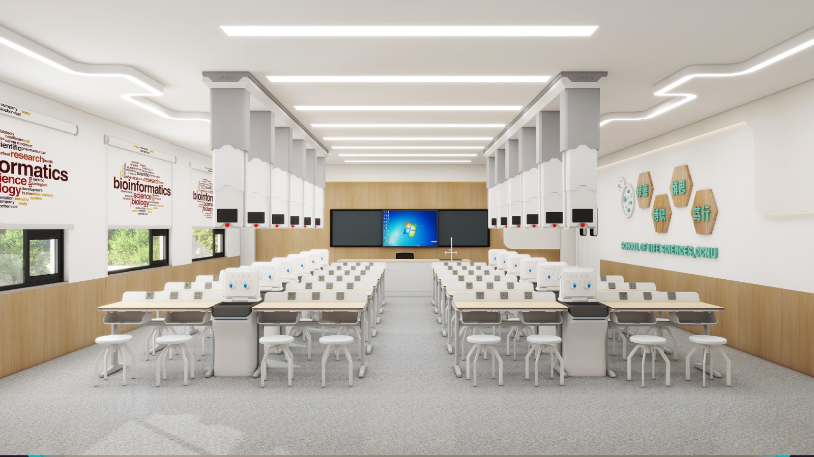 講實(shí)驗(yàn)室所需水、電、光、網(wǎng)絡(luò)等媒介全部至于頂部,為學(xué)科教室的實(shí)驗(yàn)應(yīng)用提供了靈活性。